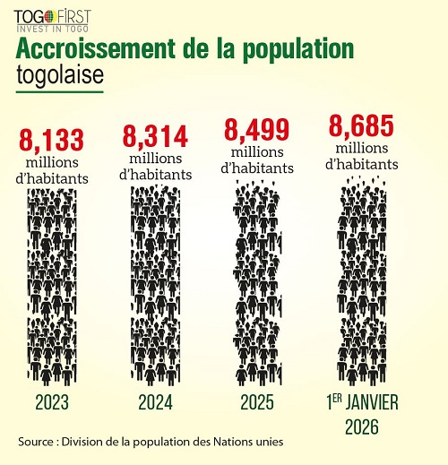 La population togolaise poursuit sa progression à un rythme soutenu. Selon les données présentées par Togo First, le pays est passé de 8,133 millions d’habitants en 2023 à 8,685 millions au 1er janvier 2026. Une hausse continue qui, si elle traduit un dynamisme démographique certain, soulève aussi des interrogations majeures sur ses implications économiques, sociales et politiques.