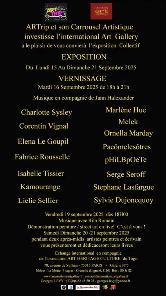 Kokou Ekouagou continue avec l’exposition Carrousel Artistique ARTrip qui se déroule du 15 au 21 septembre à l’International art gallery, 78 Avenue de Suffren Paris, avec un vernissage organisé hier 16 Septembre ouvrant l’exposition.