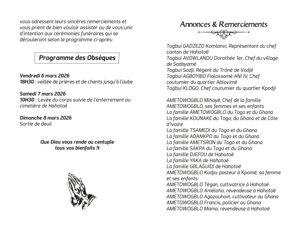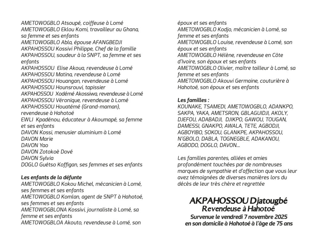 Décédée dans l’après-midi du vendredi 7 novembre 2025, Djatsougbé AKPAHOSSOU, épouse AMETOWOGBLO, à la suite d’une courte maladie, sera enterrée le samedi 7 mars prochain au cimetière de Hahotoé.