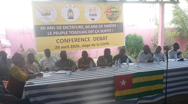Une conférence-débat à forte portée politique s’est tenue dans l’après-midi de ce mercredi 29 avril au siège de la CDPA à Lomé, réunissant plusieurs forces de l’opposition togolaise, notamment la Dynamique pour la Majorité du Peuple (DMP), la Lumière pour le Développement dans la Paix (LDP), la Dynamique Monseigneur Kpodzro (DMK) et le Front « Touche Pas à Ma Constitution ». Le thème retenu, « 60 ans de dictature, 60 ans de misère : le peuple togolais dit ça suffit ! », a donné le ton d’un échange particulièrement critique à l’égard du pouvoir en place.